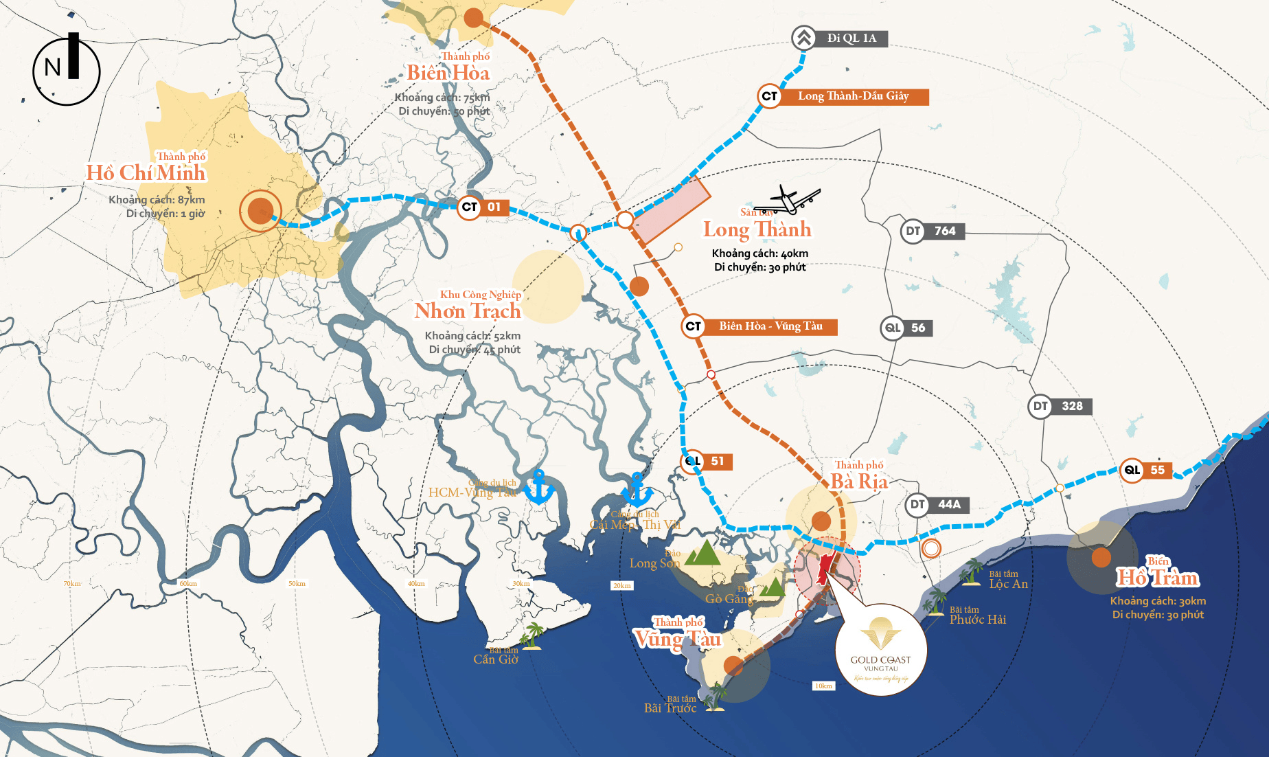 Lợi thế đầu tư: Vị trí chiến lược của Gold Coast Vũng Tàu được hưởng lợi từ các dự án hạ tầng trọng điểm như cao tốc Biên Hòa – Vũng Tàu (dự kiến hoàn thành giai đoạn 1 vào 30/4/2025), cảng Cái Mép – Thị Vải, và sân bay Long Thành, giúp tăng tiềm năng đầu tư và giá trị bất động sản.